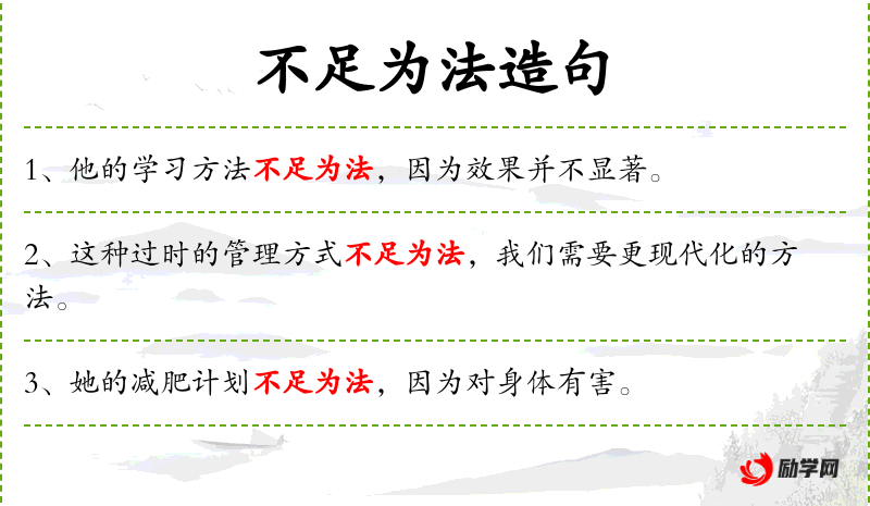 “不足为法”是一个汉语成语,反映了汉语中对学方法的评价惯。在*文化中,学方法的有效性常常被强调。