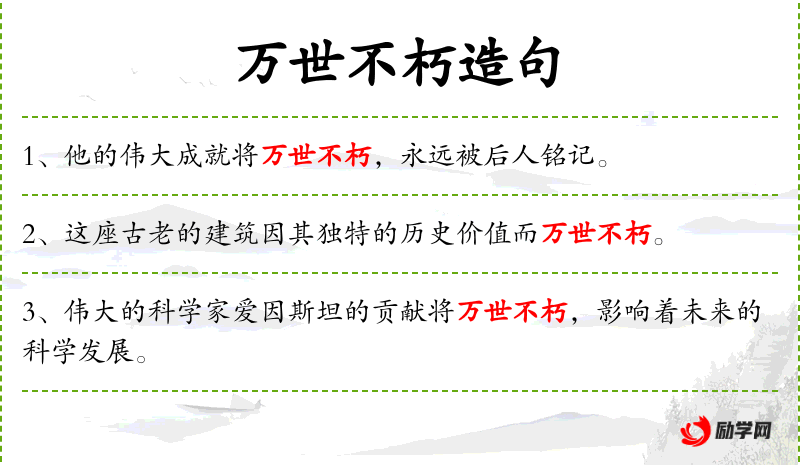 - 万世不朽:指永远流传,不会被遗忘。
