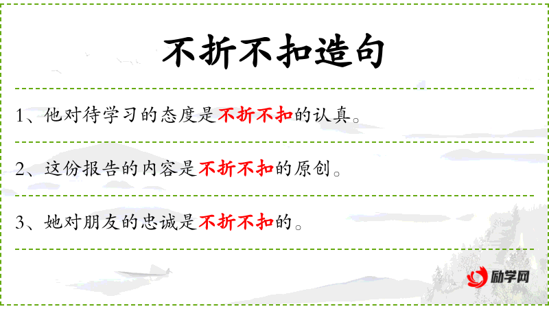 - 不折不扣:成语,形容完全、彻底。