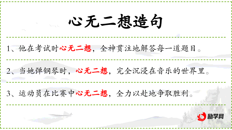 - 心无二想:表示心思集中,没有其他杂念。