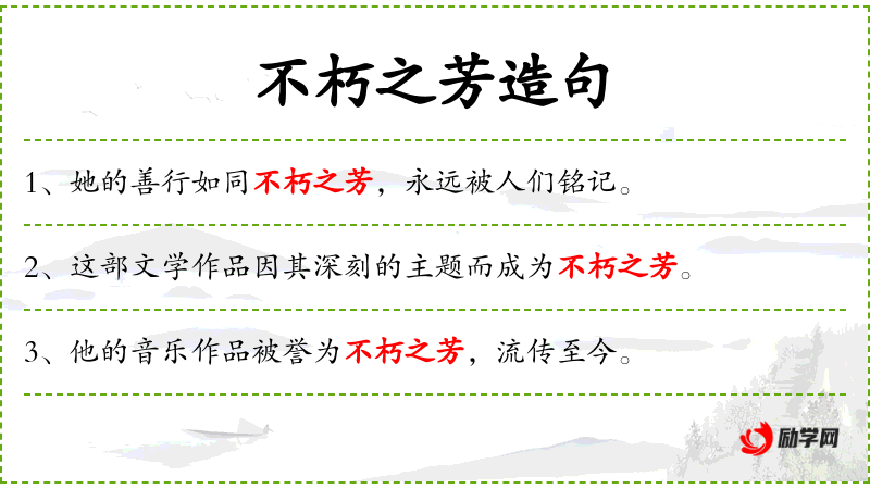 - 不朽之芳:比喻永恒的美好或影响力,源自“芳”指香气,不朽指永不消逝。