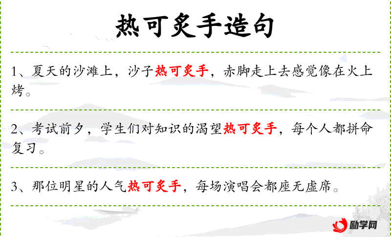 4. 【热可炙手】 - 火热可以灼手。比喻权势显赫。同“炙手可热”。