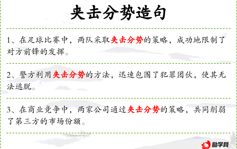 - 状语:在商业竞争中,通过夹击分势的策略,共同