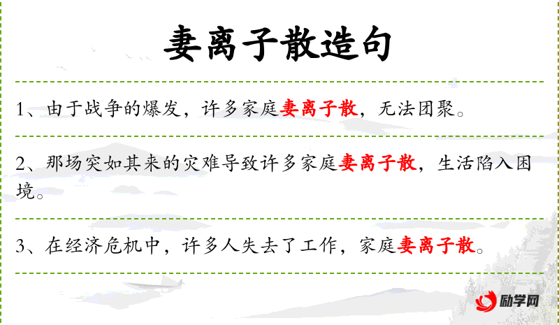 1. 【妻离子散】 一家子被迫分离四散。