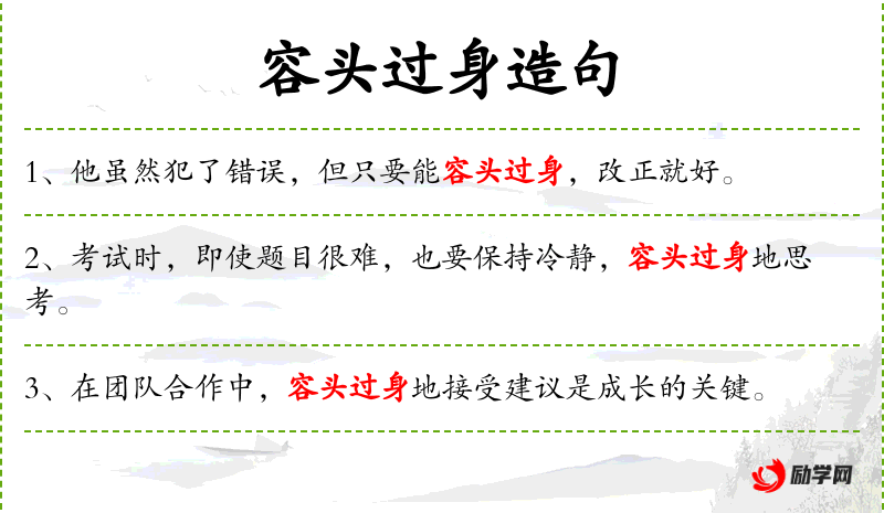 “容头过身”是一个成语,源自**传统文化,表示宽容和原谅。这个句子体现了中华文化中强调的“宽以待人”的价值观。