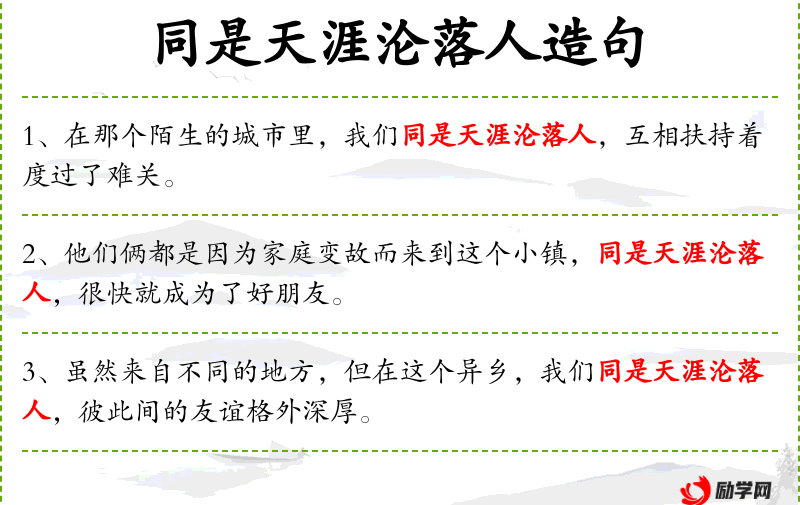 - 同是天涯沦落人:成语,意指同样身处困境的人。