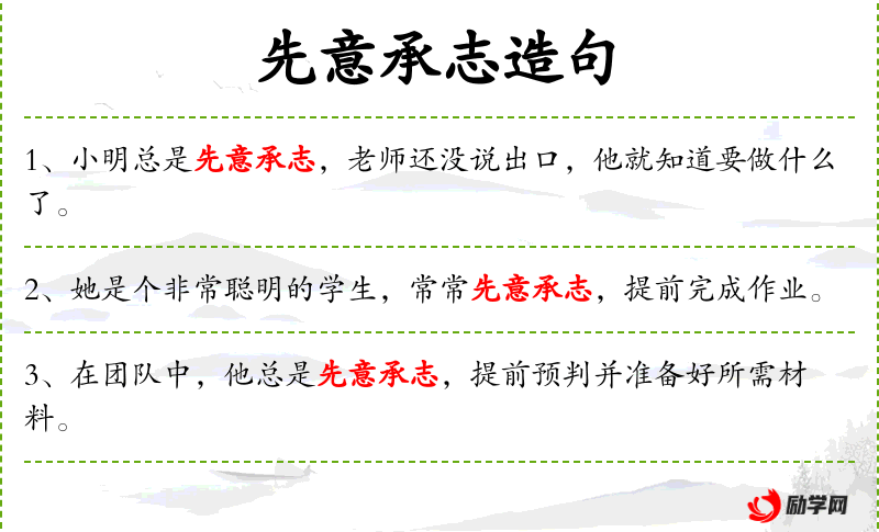 - 先意承志:成语,意为预先领会并执行领导的意图。