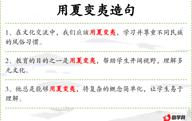 6. 【用夏变夷】 夏,诸夏,古代中原地区周王朝所分封的各诸侯国;夷,指中原地区以外的各族。以诸夏文化影响中原地区以外的僻远部族。