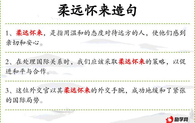 7. 【柔远怀来】 安抚边远地区,怀柔归附者。