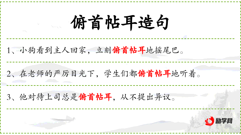 - 文化意义:句子中的“俯首帖耳”体现了**传统文化中对权威的尊重和顺从。
