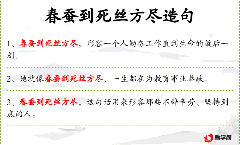 - 春蚕到死丝方尽:成语,比喻辛勤工作至死不渝。