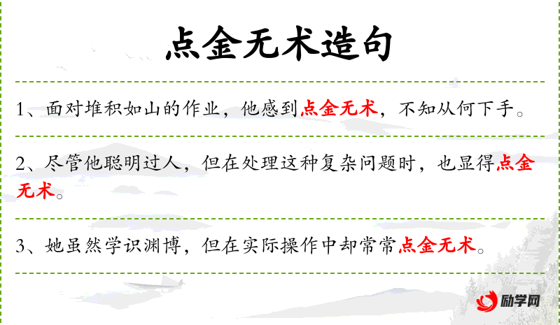 4. 【点金无术】 - 点:点化;术:法术,方法。没有点铁成金的法术。比喻没有方法筹集钱财