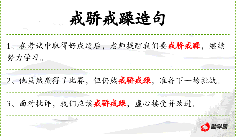 1. 【戒骄戒躁】 戒:警惕,预防。警惕并防止产生骄傲和急躁情绪。