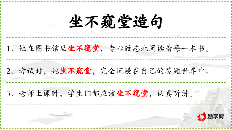 - 坐不窥堂:这是一个成语,意思是形容人非常专心,连周围的环境都不看一眼。