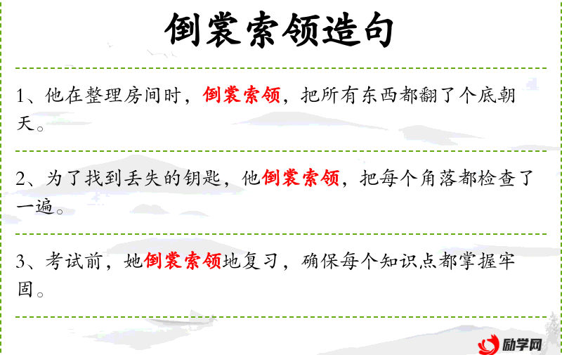 - 倒裳索领地:这是一个成语,意思是做事非常细致、认真,不放过任何细节。