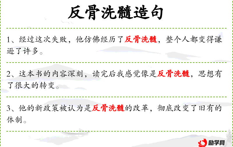 - 反骨洗髓:这个成语来源于**传统文化,比喻彻底改变一个人的本性和思想。
