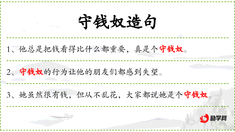 - 守钱奴:名词,比喻过分节俭或吝啬的人。