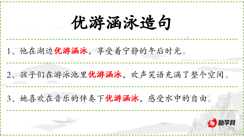 - 优游涵泳:形容词,意为悠闲自在地游泳。