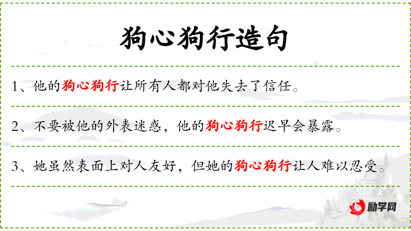 1. 【狗心狗行】 - 比喻歹毒的心肠、行为。