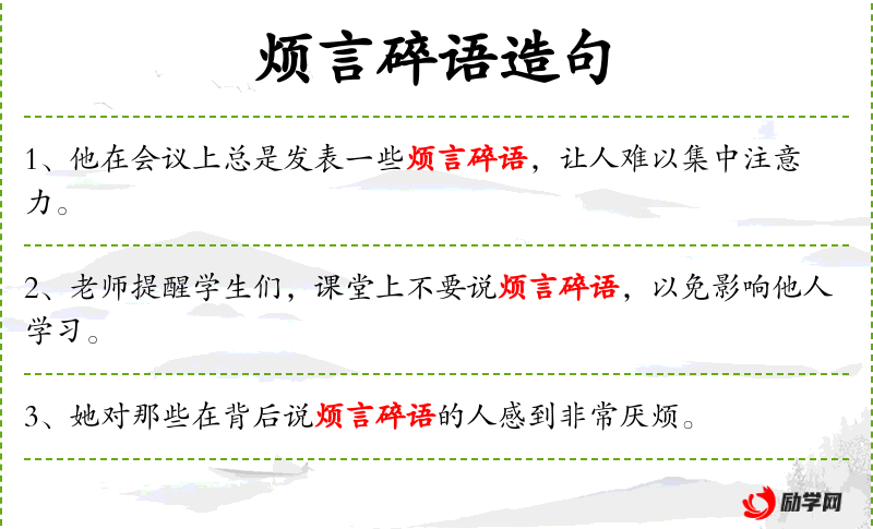 5. 【烦言碎语】 - 烦:多,繁剧;碎:琐碎。形容文词杂乱、琐碎。