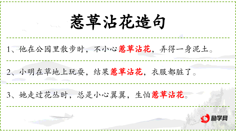 句子中的“惹草沾花”是一个成语,源自**传统文化,常用来形容男女之间的轻浮行为。在这里,它被用来形容对花朵的细心保护,体现了对自然美的尊重。