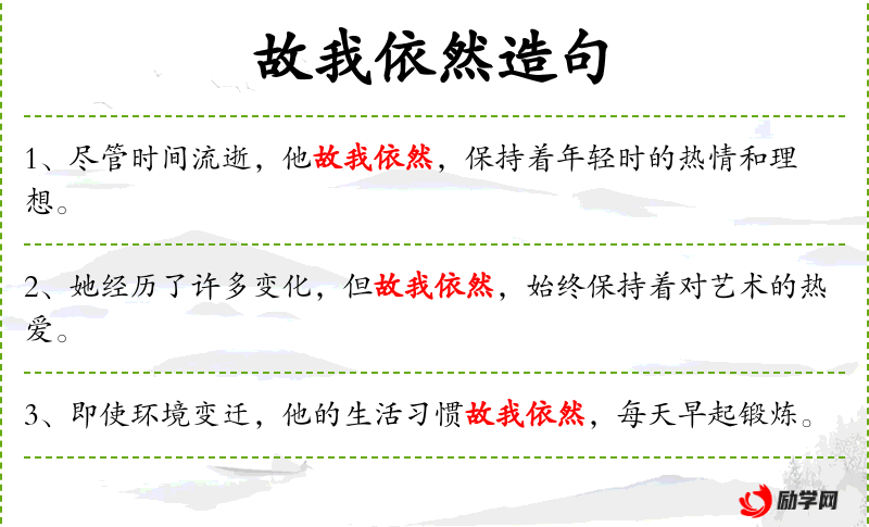 1. 【故我依然】 故我:旧日的我。仍旧是过去的我。指自己的境况和从前一样,没有变化。