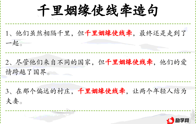 - 文化背景中,“千里姻缘一线牵”是**传统成语,强调缘分的重要性。