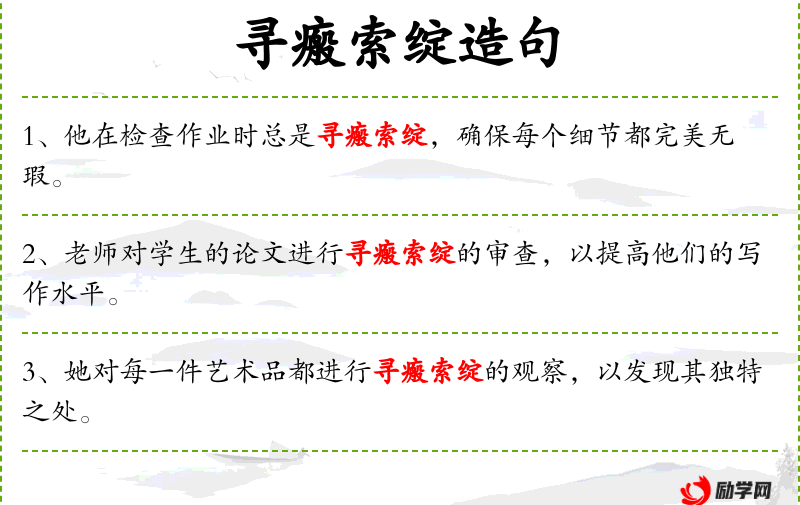 - 文化意义:在**文化中,“寻瘢索绽”这个成语体现了对完美和卓越的追求,与“精益求精”等成语有相似的文化内涵。