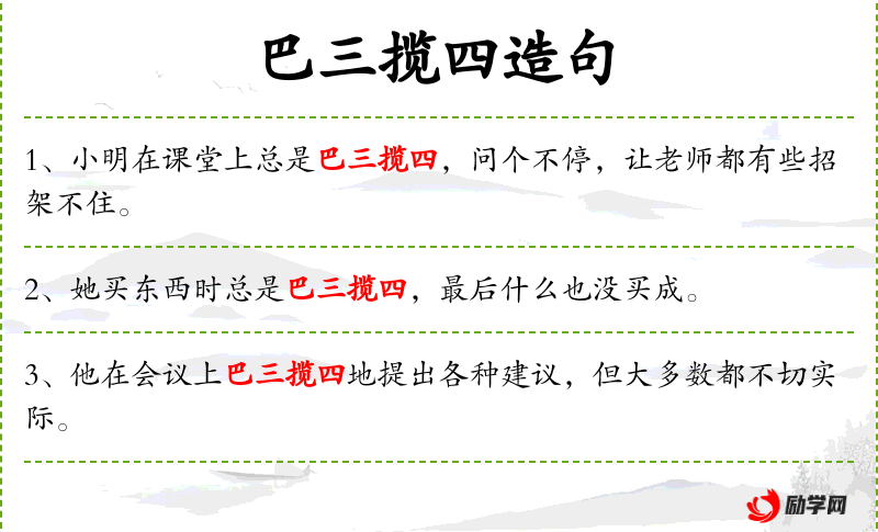 - 巴三揽四:这是一个成语,意思是说话或写文章东拉西扯,没有条理,使人难以理解。