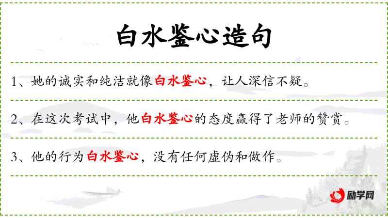 4. 【白水鉴心】 - 白水:清水;鉴:照。清澈的水能照见人的心。形容人心像明净的水一样纯洁。