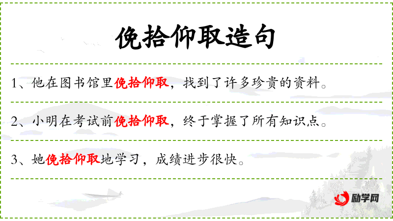 - 俛拾仰取:成语,形容勤奋学,不放过任何学机会。