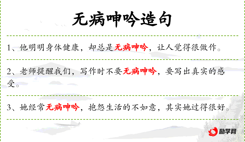 - 无病呻吟:成语,形容没有实际问题却故意表现出痛苦或不满。