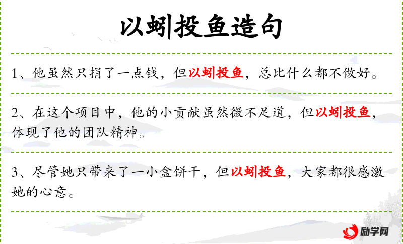 句子:“虽然他只是偶尔帮忙,但以蚓投鱼,社区的每个人都感受到了他的善意。”