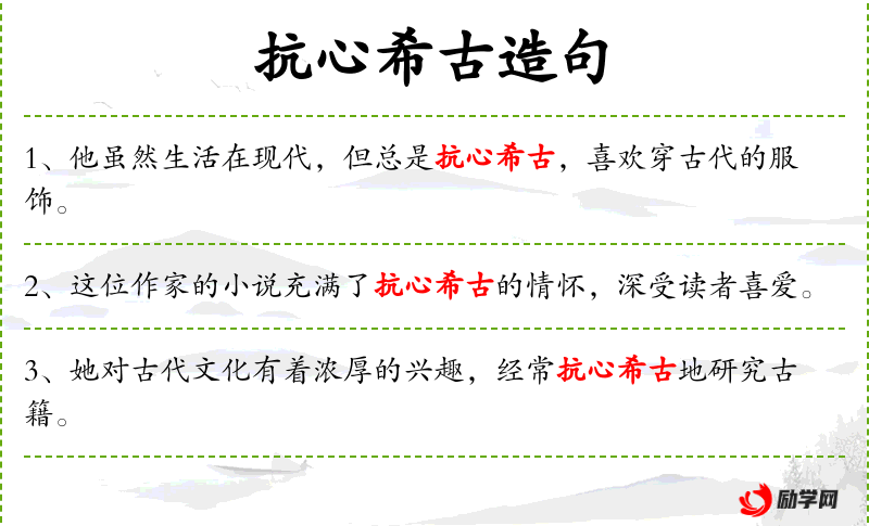 - 抗心希古:这个成语反映了一种对古代文化的向往和对现代社会的不满。在**文化中,古代往往被赋予一种理想化的色彩,而现代则可能被视为浮躁或缺乏深度。