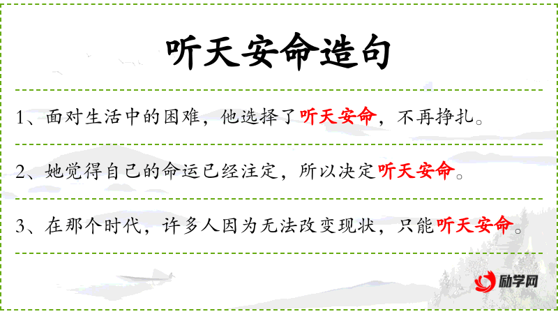 - 听天安命:这个成语源自**传统文化,强调接受命运的安排,不再挣扎。
