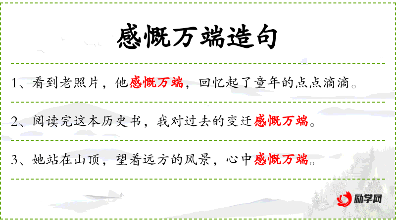 - 变化句式:“这本历史书让我对过去的变迁感慨不已。”
