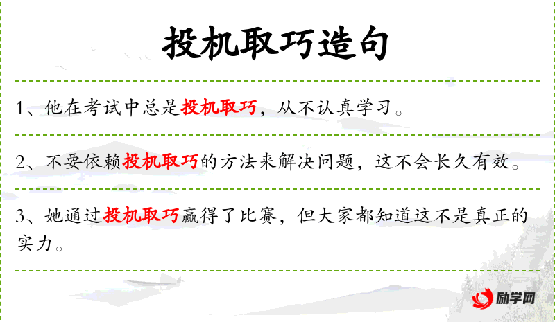 - 投机取巧:指利用不正当手段或捷径来达到目的,通常带有贬义。
