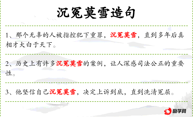 7. 【沉冤莫雪】 沉冤:长期得不到伸雪的冤案;莫雪:无法昭雪。长期得不到昭雪的冤屈。