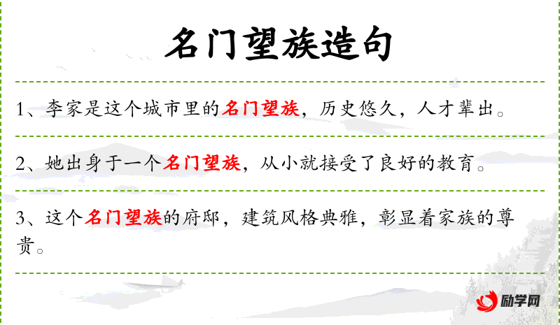 - 名门望族:指有显赫地位和声望的家族。