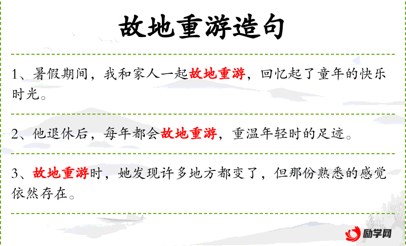 5. 【故地重游】 故地:曾经居住过的地方。重又回到过去生活过的地方游览。