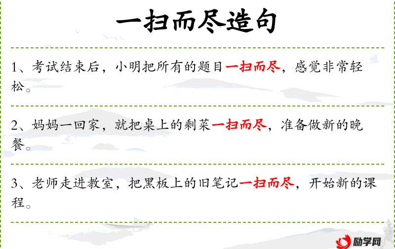 1. 【一扫而尽】 - 一下子便扫除干净。比喻彻底清除干净。