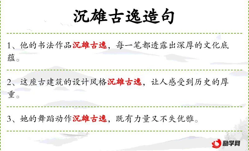 2. 【沉雄古逸】 - 沉雄:深沉雄健;逸:超迈。形容书画风格沉毅雄健,古朴飘逸。