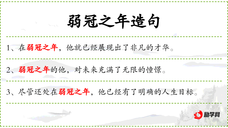 “弱冠之年”这一表达蕴含了**古代的文化意义,指的是男子成年礼的年龄。了解这一背景有助于更深刻地理解句子的文化内涵。