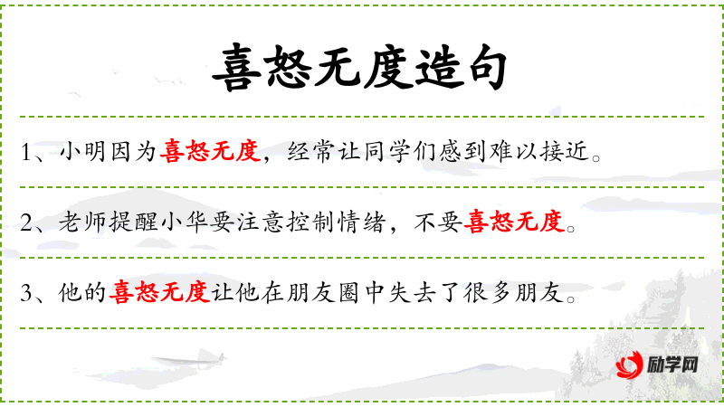 - 喜怒无度:形容词短语,表示情绪波动大,没有节制。
