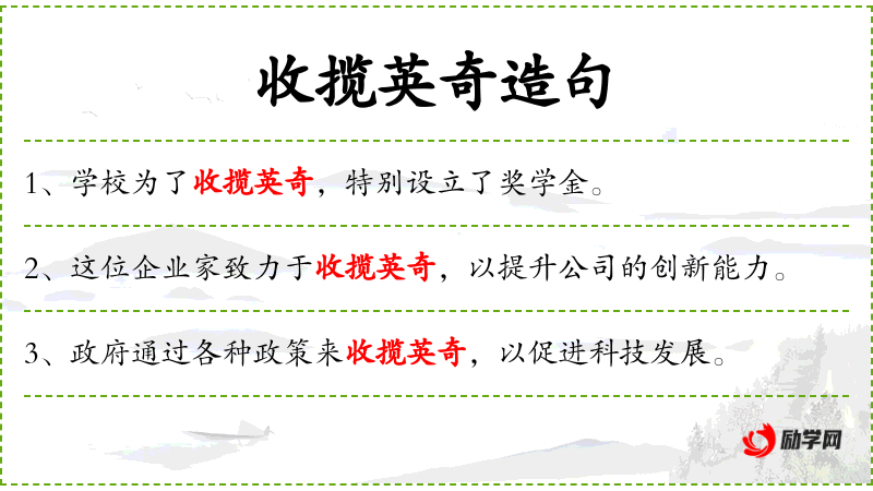 1. 【收揽英奇】 收揽:招纳。招纳英雄奇才。