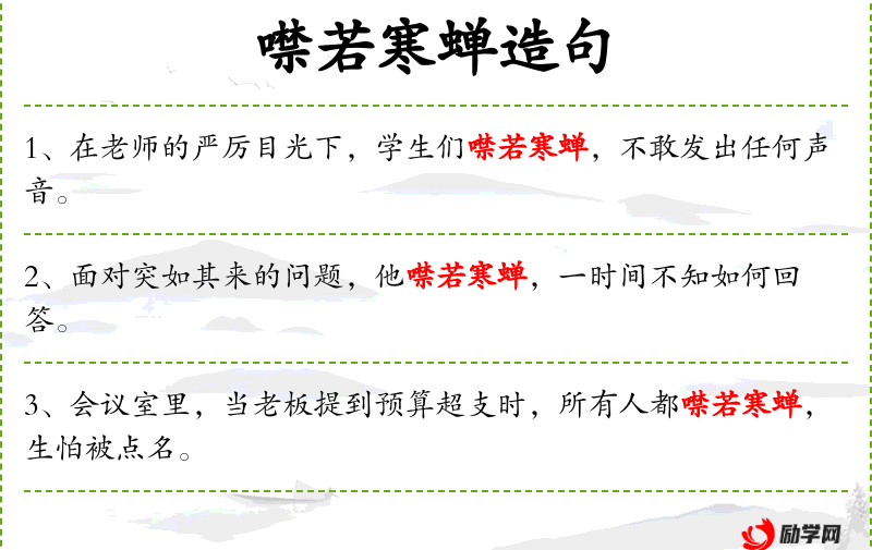 - 噤若寒蝉:闭口不言、沉默寡言