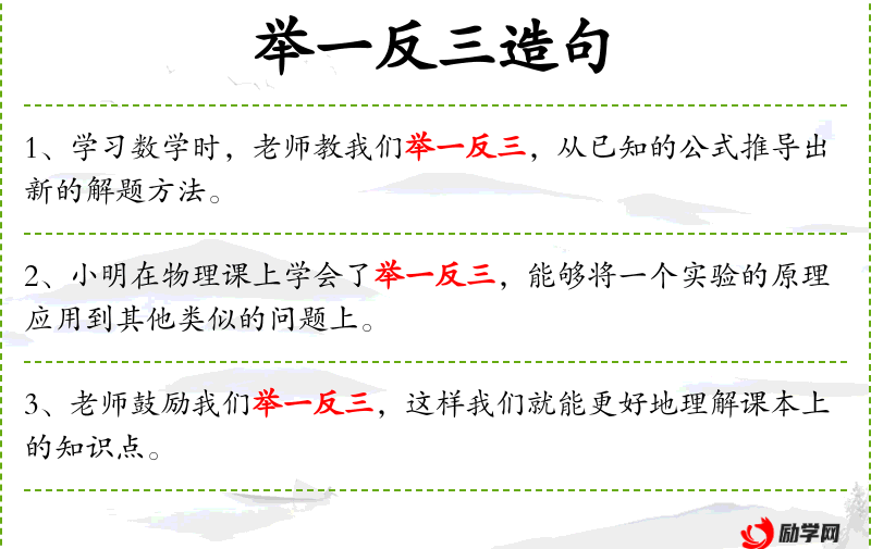 - 英文:The learning method of "drawing inferences about other cases from one instance" allows Xiaohua to better understand the climate characteristics of different regions in geography class.