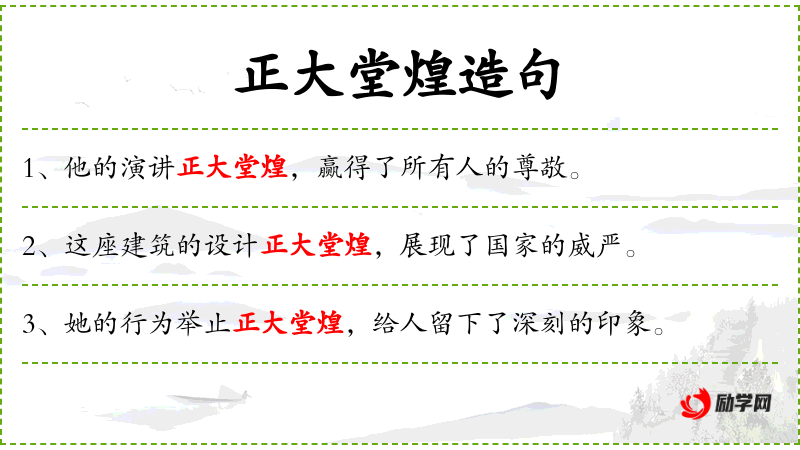 4. 【正大堂煌】 - 犹言堂堂正正。亦作“正大堂皇”。