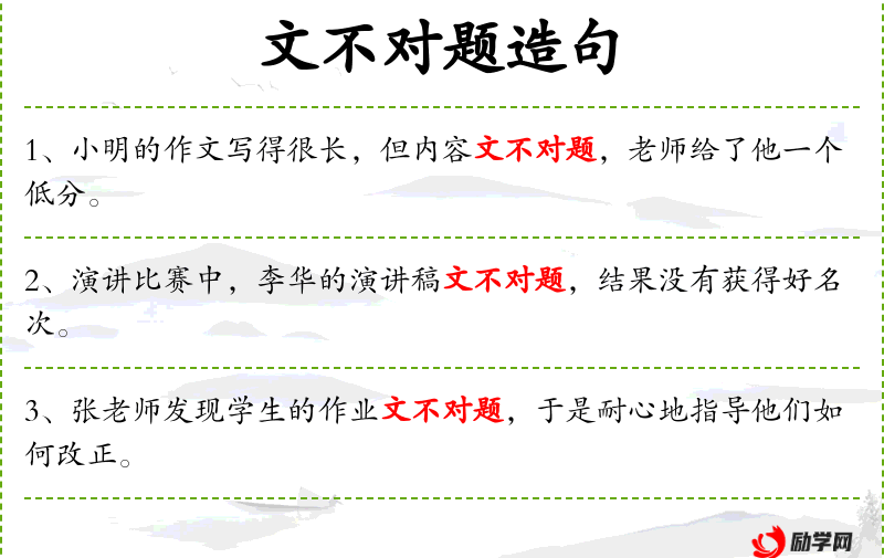 - 文不对题:成语,表示内容与主题不符。