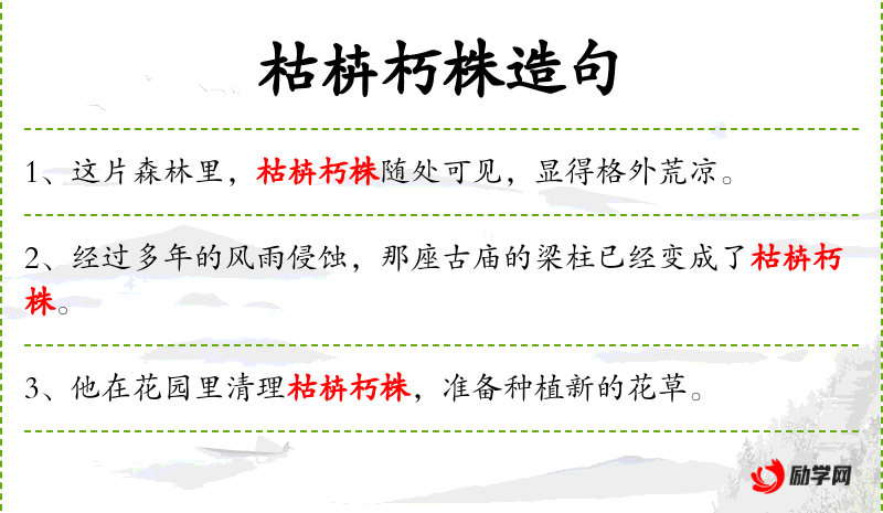 2. 【枯枿朽株】 - 枯朽的枝干。形容事物死气沉沉。